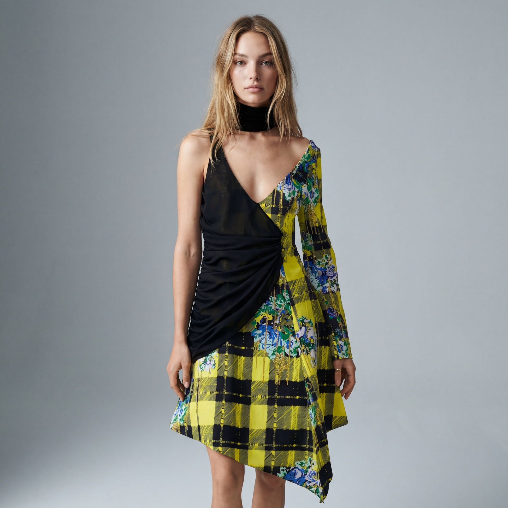 •This mixed media print blocked dress gives a striking finish with this seasons bouquet plaid print crafted on paper canvas, and fine mesh drapery. Heavy roached detailing side seams adds depth and interest. Neckline is adorned with mesh neckband adding vintage femininity. This garment meets the highest demands and aligns with Abel Honor’s standards.