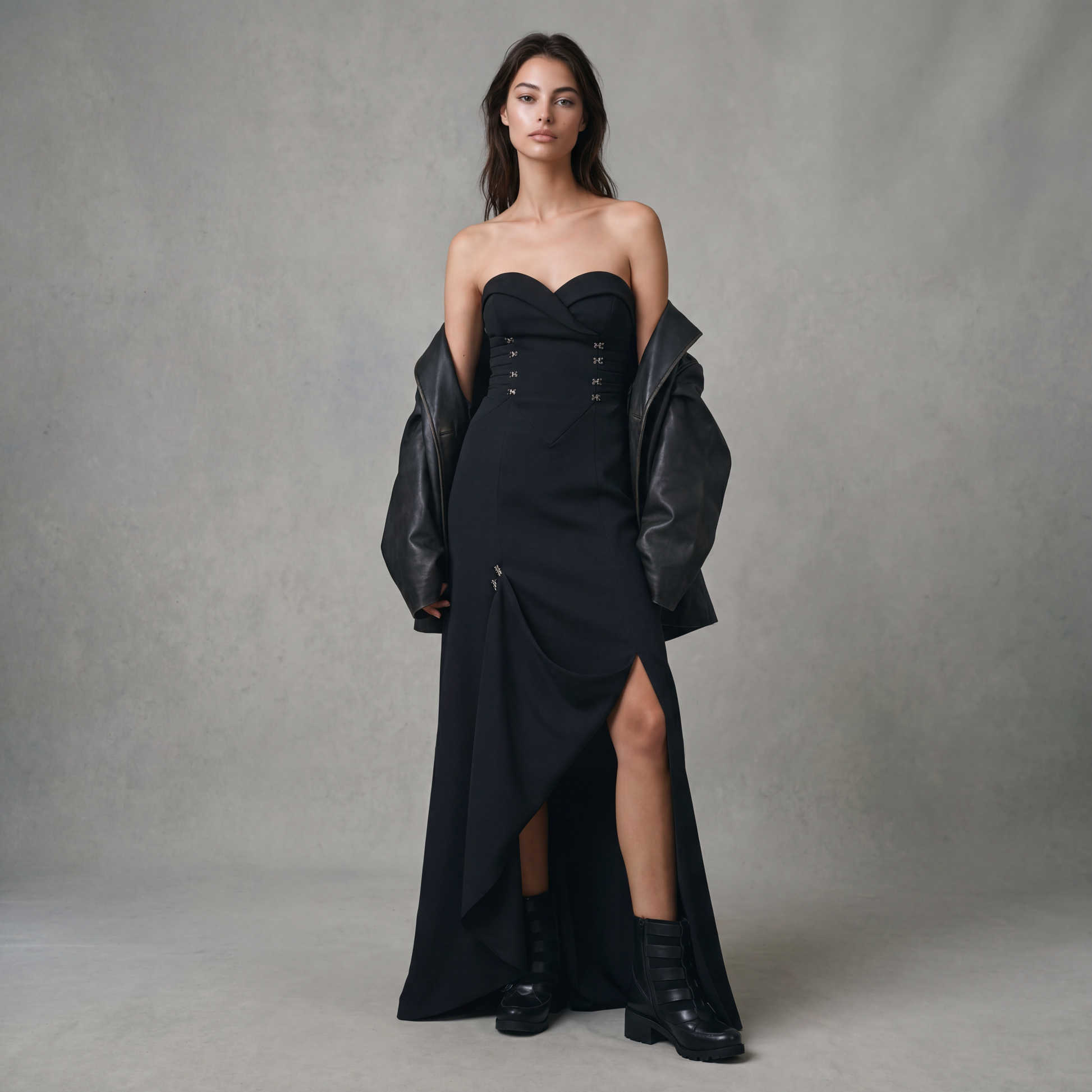 - This long evening dress with a sweetheart upper bodice shape is a floor-length piece crafted from our lush fluid sateen. The skirt has an exaggerated slit with an anchored flap by our signature oversized Hook & Eye trim making this piece chic yet trendy. Contrasted with a structured bodice and bustier, this dress adds a feminine and sexy finishing touch. This garment meets the highest demands and aligns with Abel Honor’s standards.