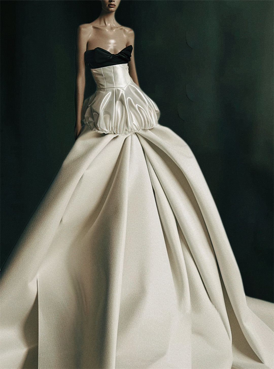 Strapless bodice in black duchess satin with visible seaming and a cinched waist, topped with a voluminous bubble peplum in silk satin for a sculpted silhouette. The skirt unfolds into generous pleats, creating controlled volwne and clean vertical lines.