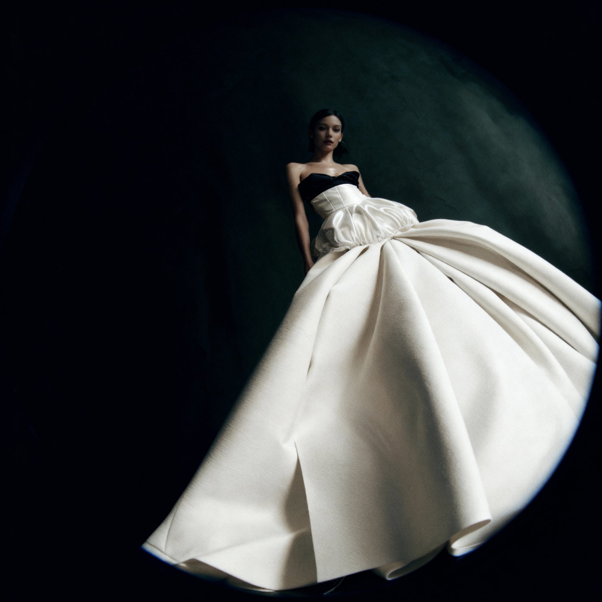 Black duchess satin bodice, overlaid with a silk satin peplum; full skirt in heavy matte organza with structural underlayers.
