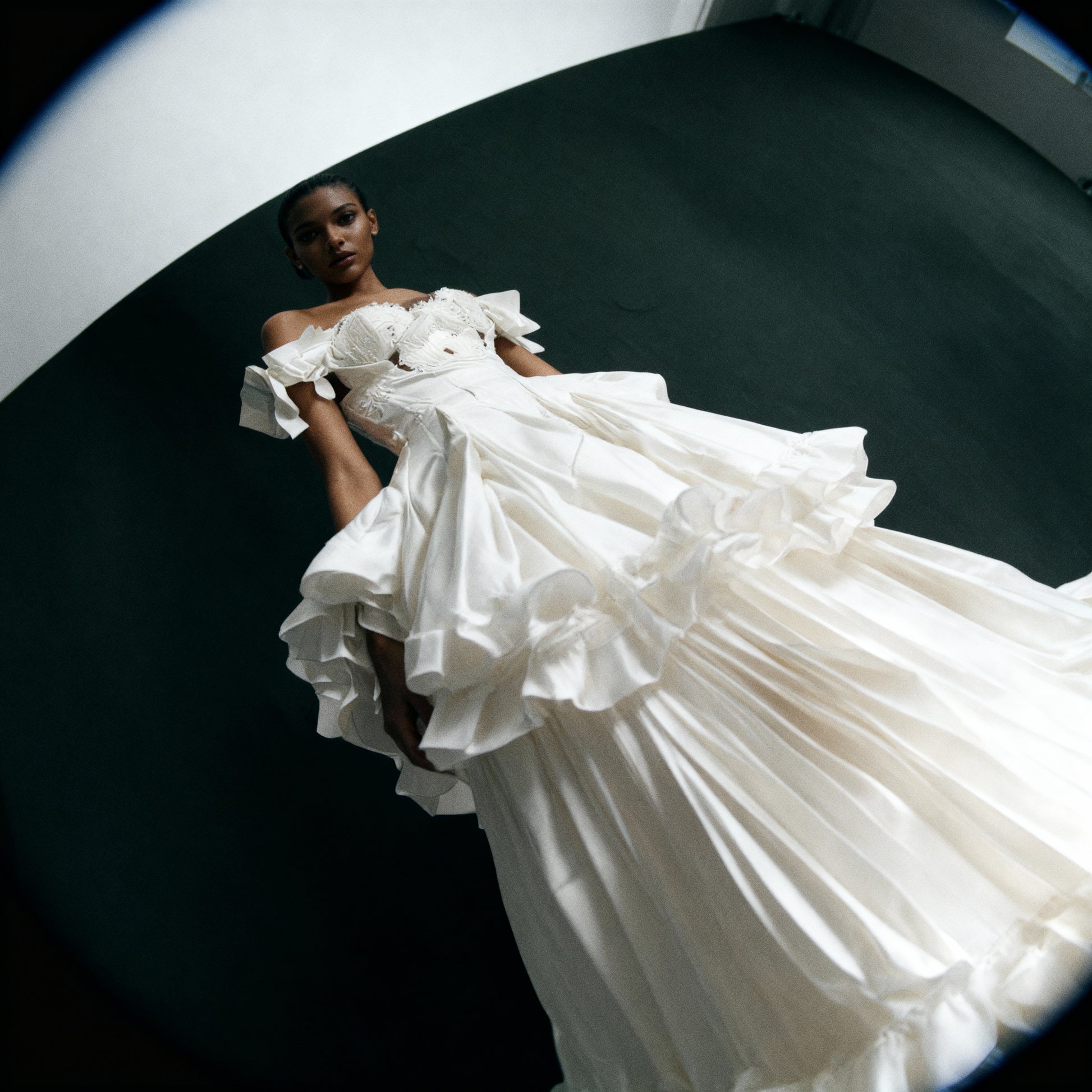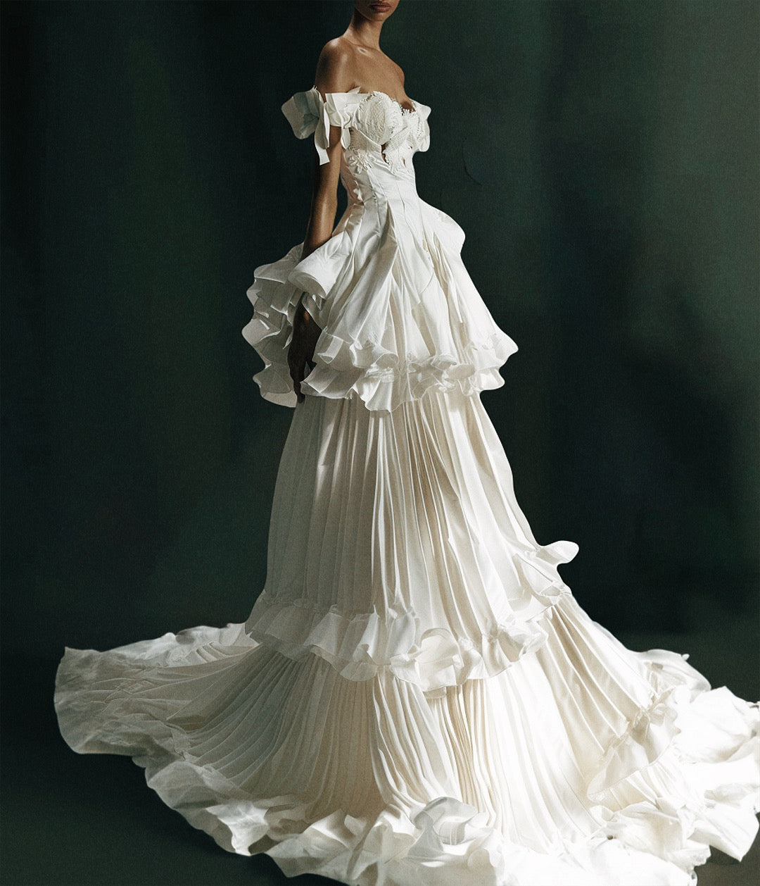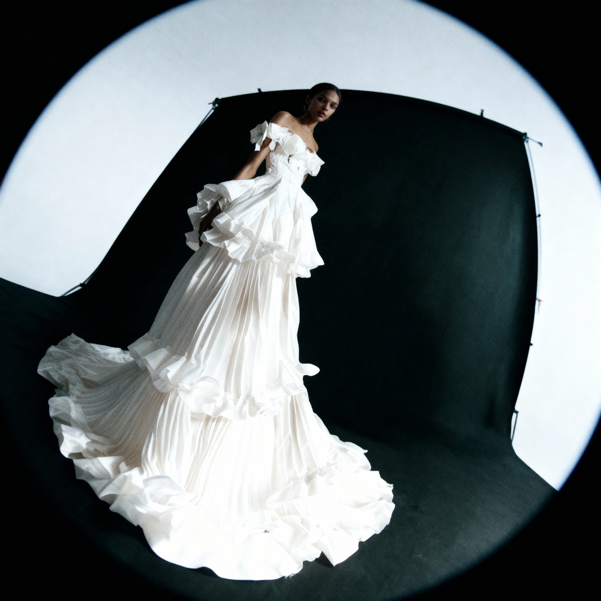 This gown features a sharply pleated off-the-shoulder collar that wraps the neckline and tapers into a cinched bodice. The skirt erupts into a structured, asymmetrical balloon silhouette with sculptural folds and sweeping volume - a modern take on regal drama.
