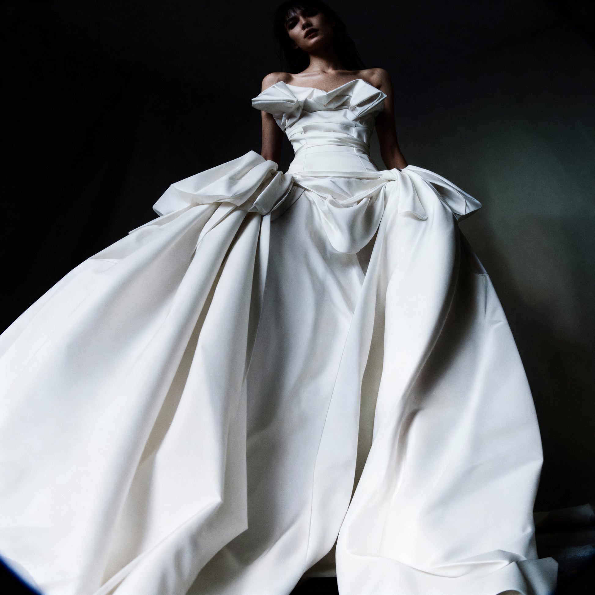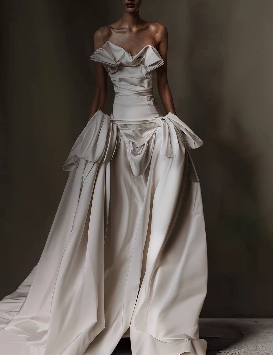 A sweetheart neckline corseted bodice with sculpted origami-like folds frames the neckline and bust, folding seamlessly into an architectural waist. Generous draped panels cascade from each hip, creating volume and movement without compromising the gown’s clean column base. The silhouette blends modern grace with classic couture gravity.