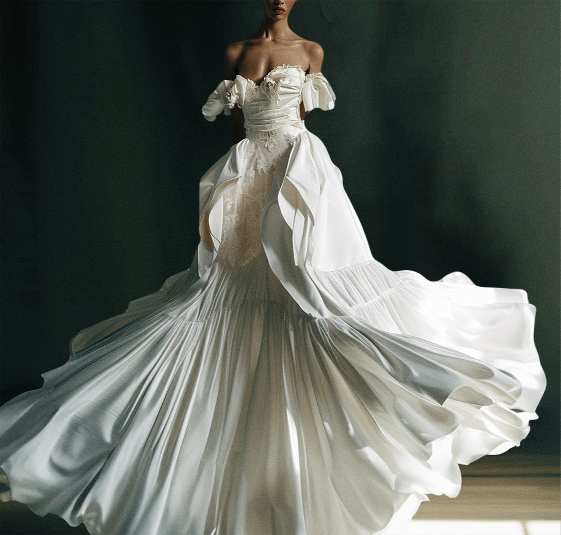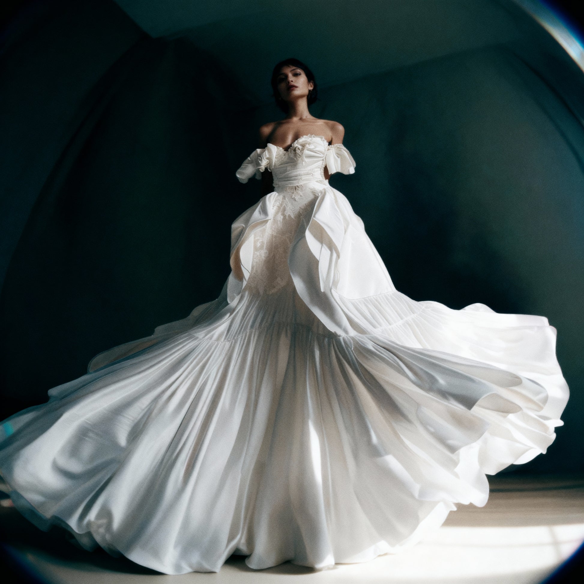 A sharply tailored sweetheart bodice flows into a sculptural fit-and-flare silhouette. The true drama emerges at the back - a cascading high-volume ruffle that trails from the waist into a dramatic train, crafted from layered silk organza with directional folds. A strong front with an unexpectedly soft exit.