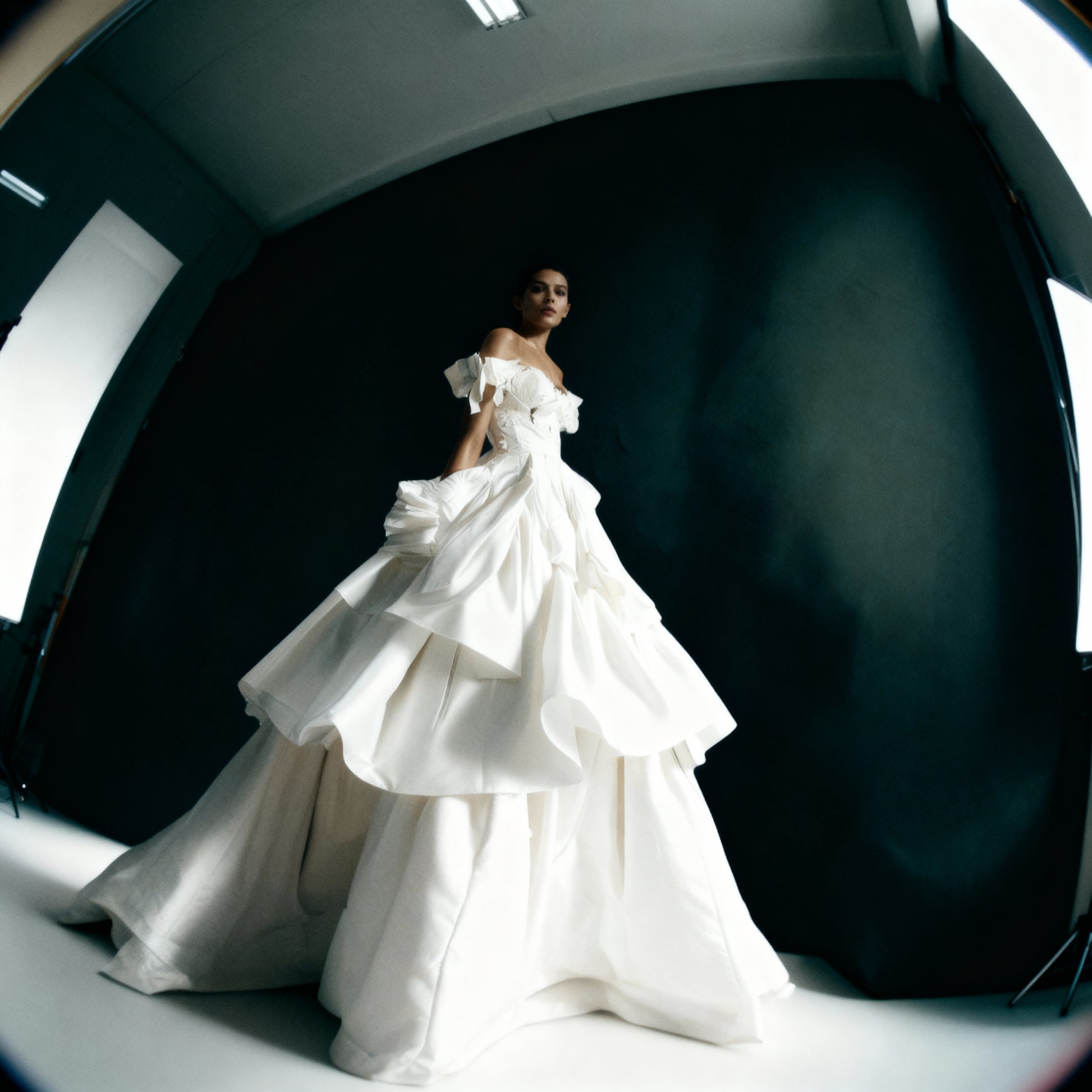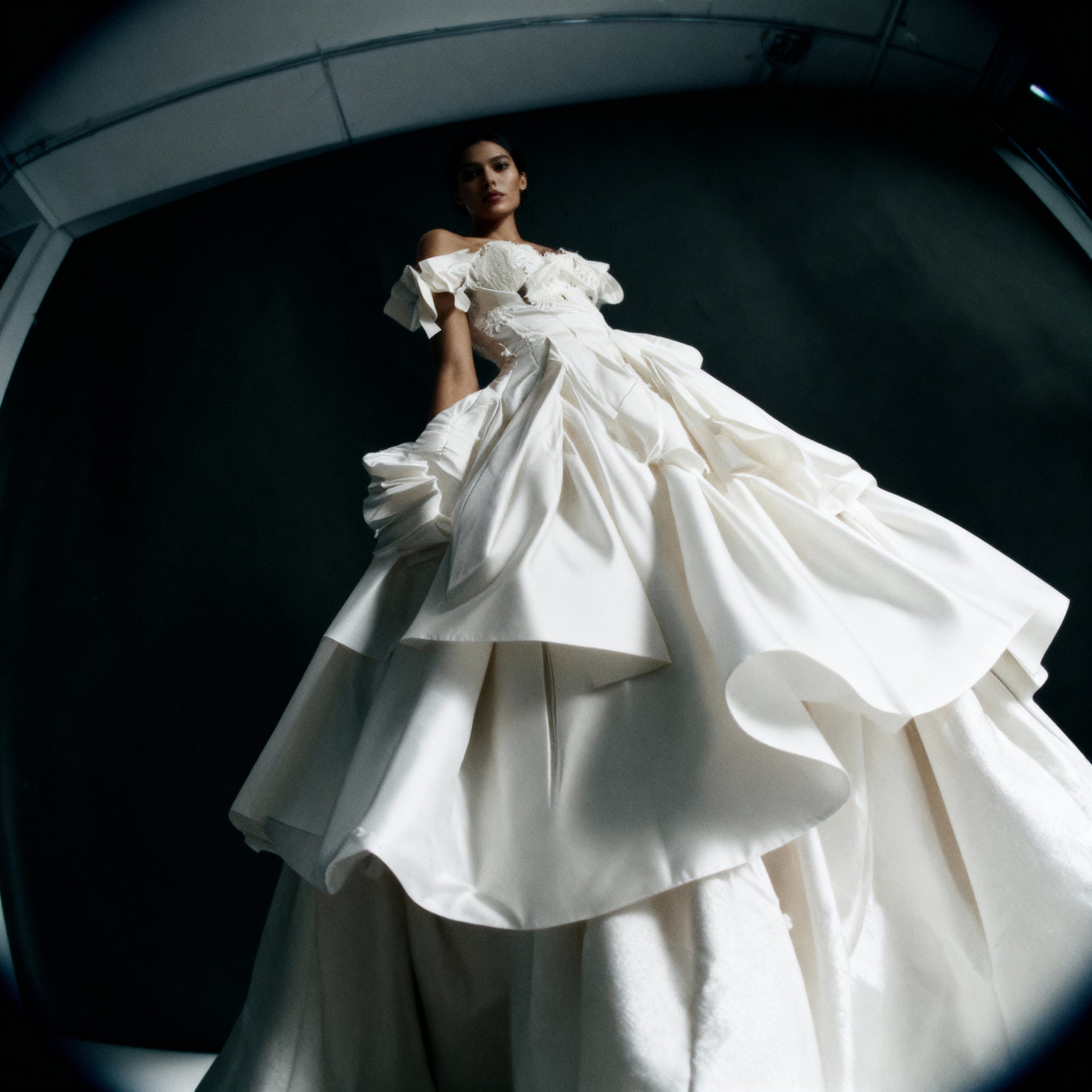 An asymmetrically draped off-the-shoulder neckline adds movement and modernity to the fitted bodice. The high-volume bubble skirt emerges from a sharply curved basque waist, creating a bold hourglass silhouette. Sculptural proportions are balanced by a smooth flared underskirt with clean vertical seaming.