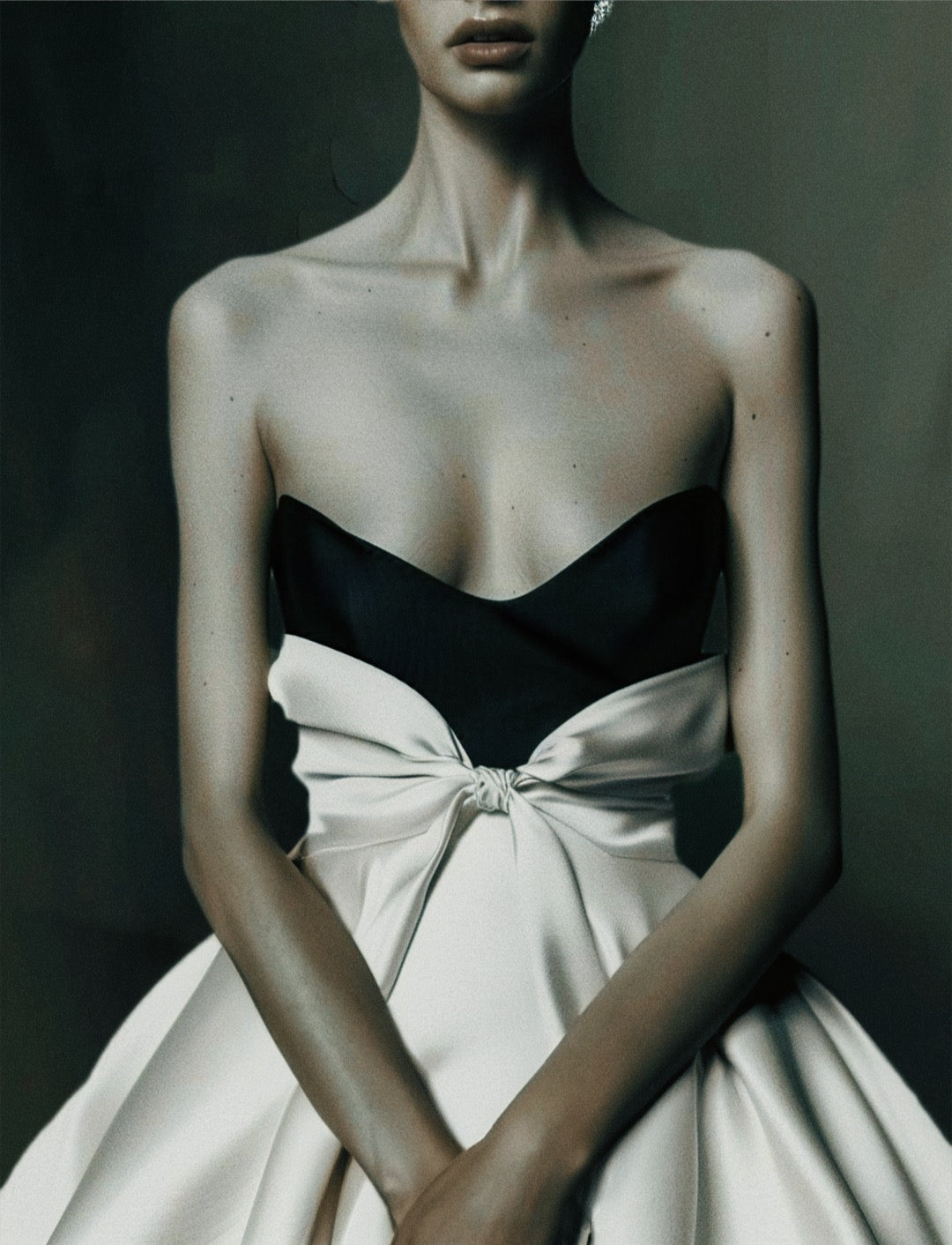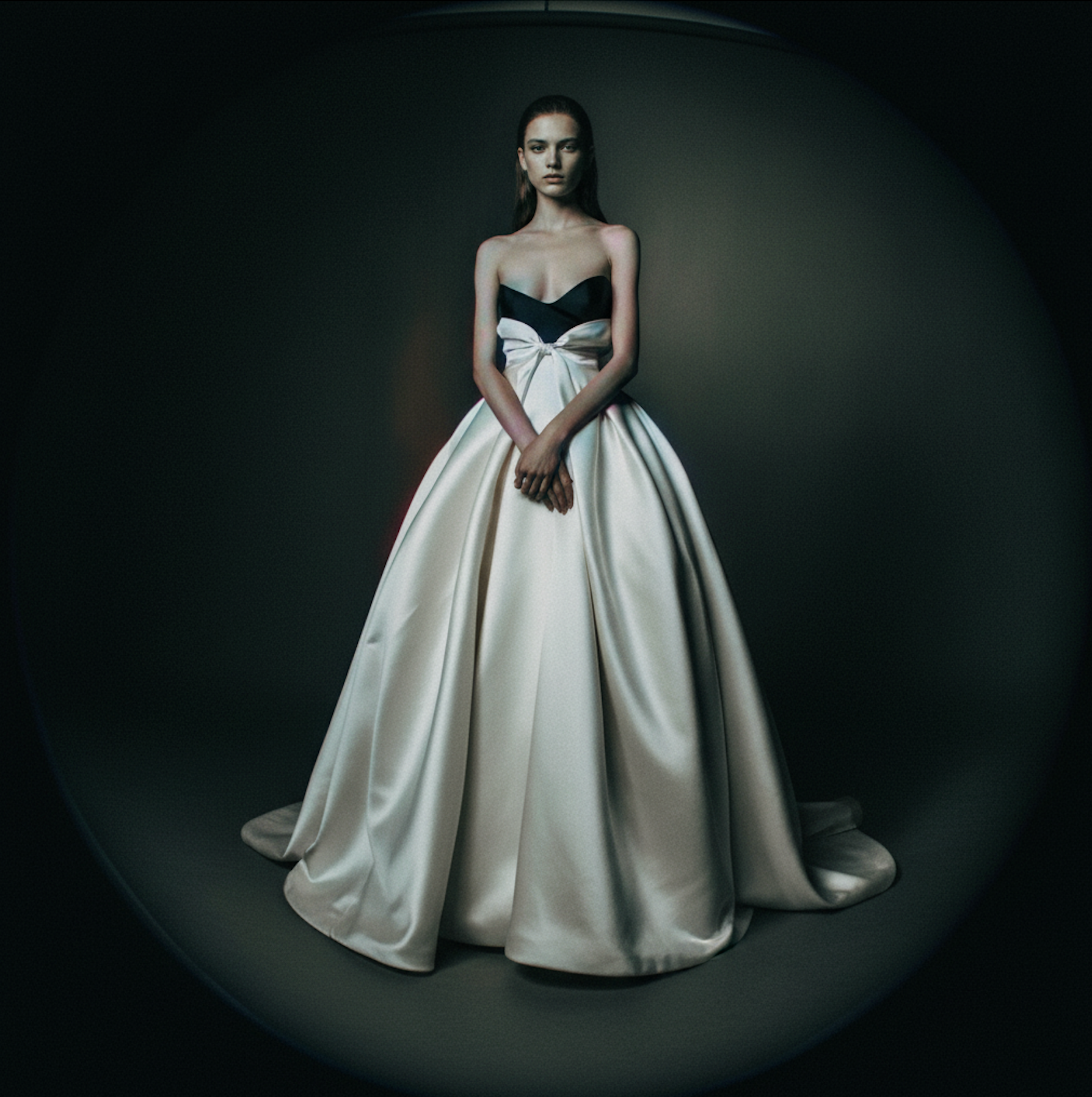 Sweetheart corseted bodice in contrasting black with a clean, sculpted neckline. A soft but architectural bow cinches the waist, seamlessly integrated into the volwninous A-line skirt. The skirt features full pleats radiating from the waist for depth and movement.