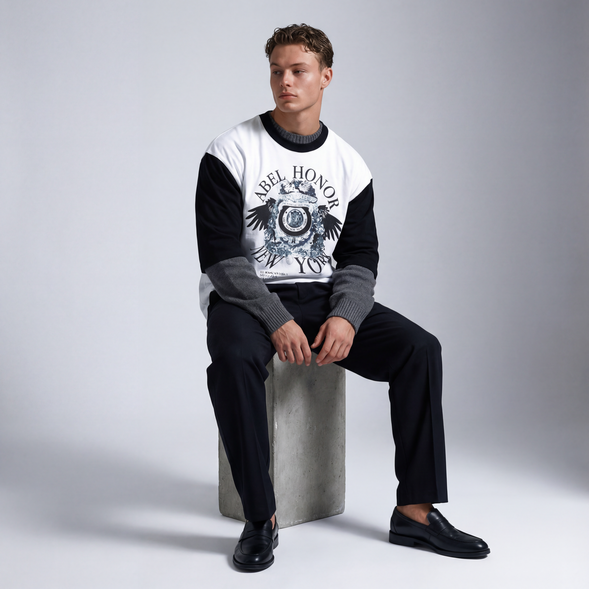•This regular-fitting baseball tee showcases the season's collegiate graphic, which features the Abel angel atop overlooking a shrine-like imagery at center front of print. There is a state of New York Abel Honor badge that represents duty, aim, and authority. The vined flowers and black raven wings serve to the Avant-Contention concept for this season. This garment highlights two toned features and color blocking. Cut from medium weight responsibly produced cotton looped into a condensed jersey knit.