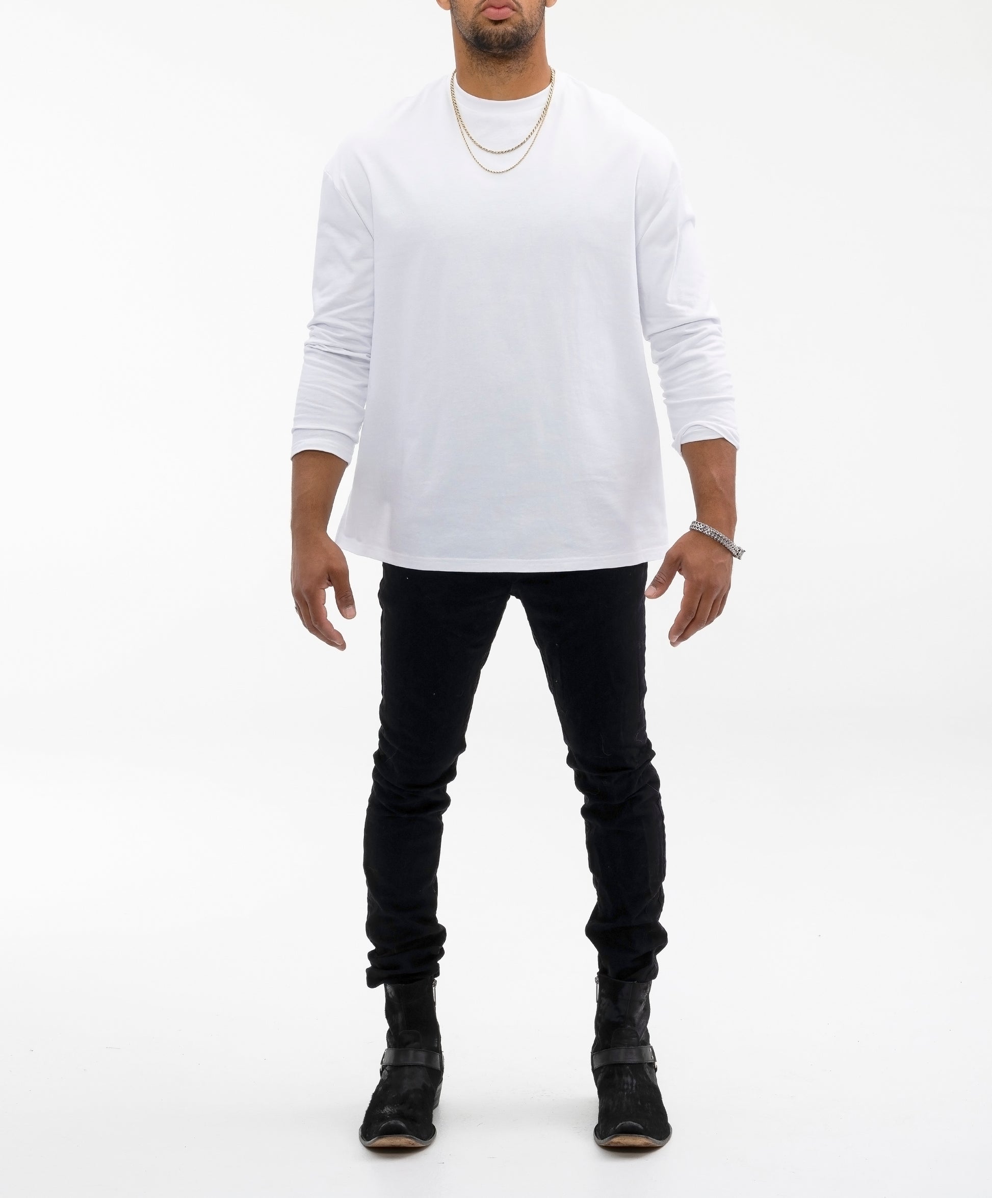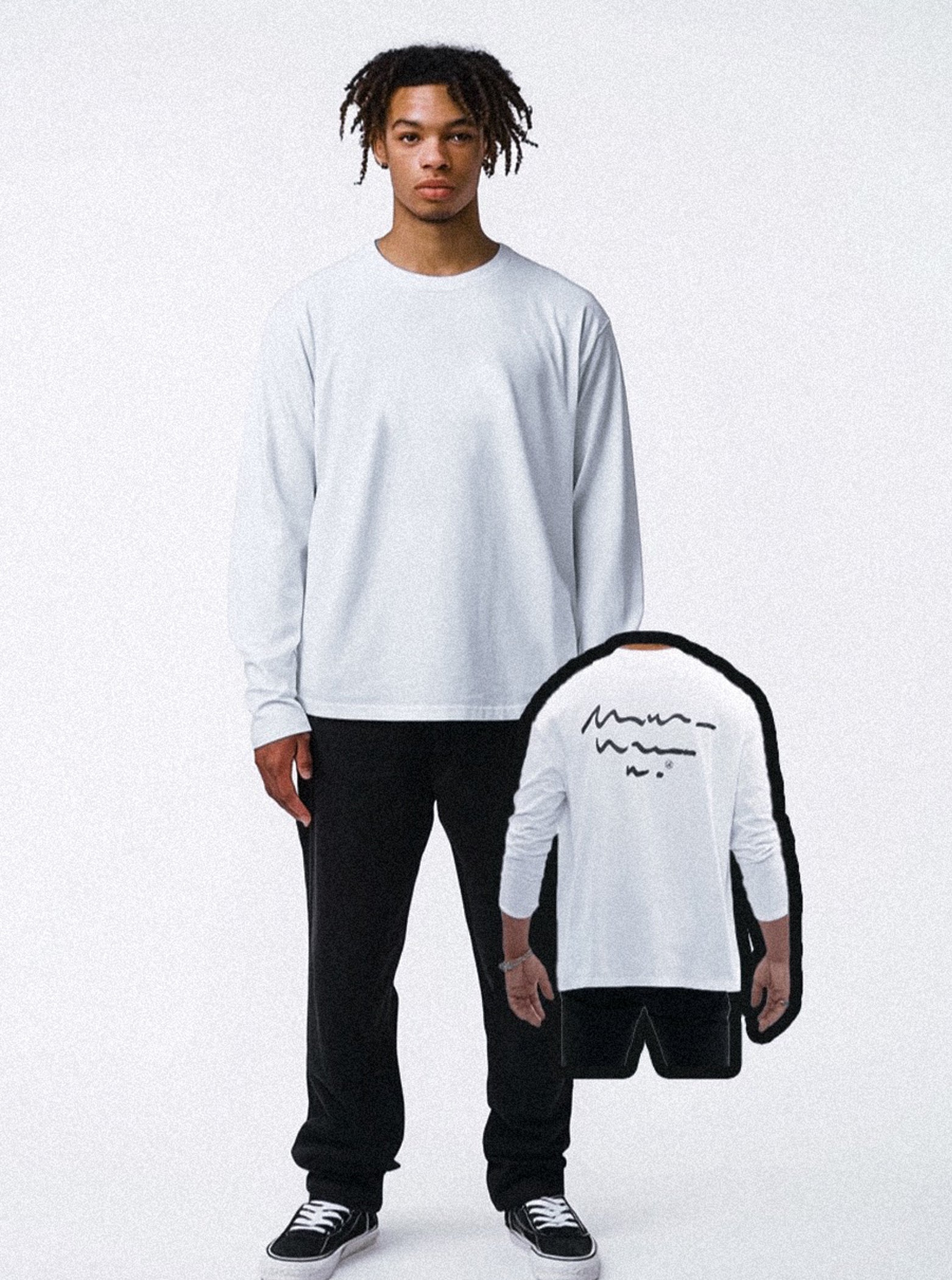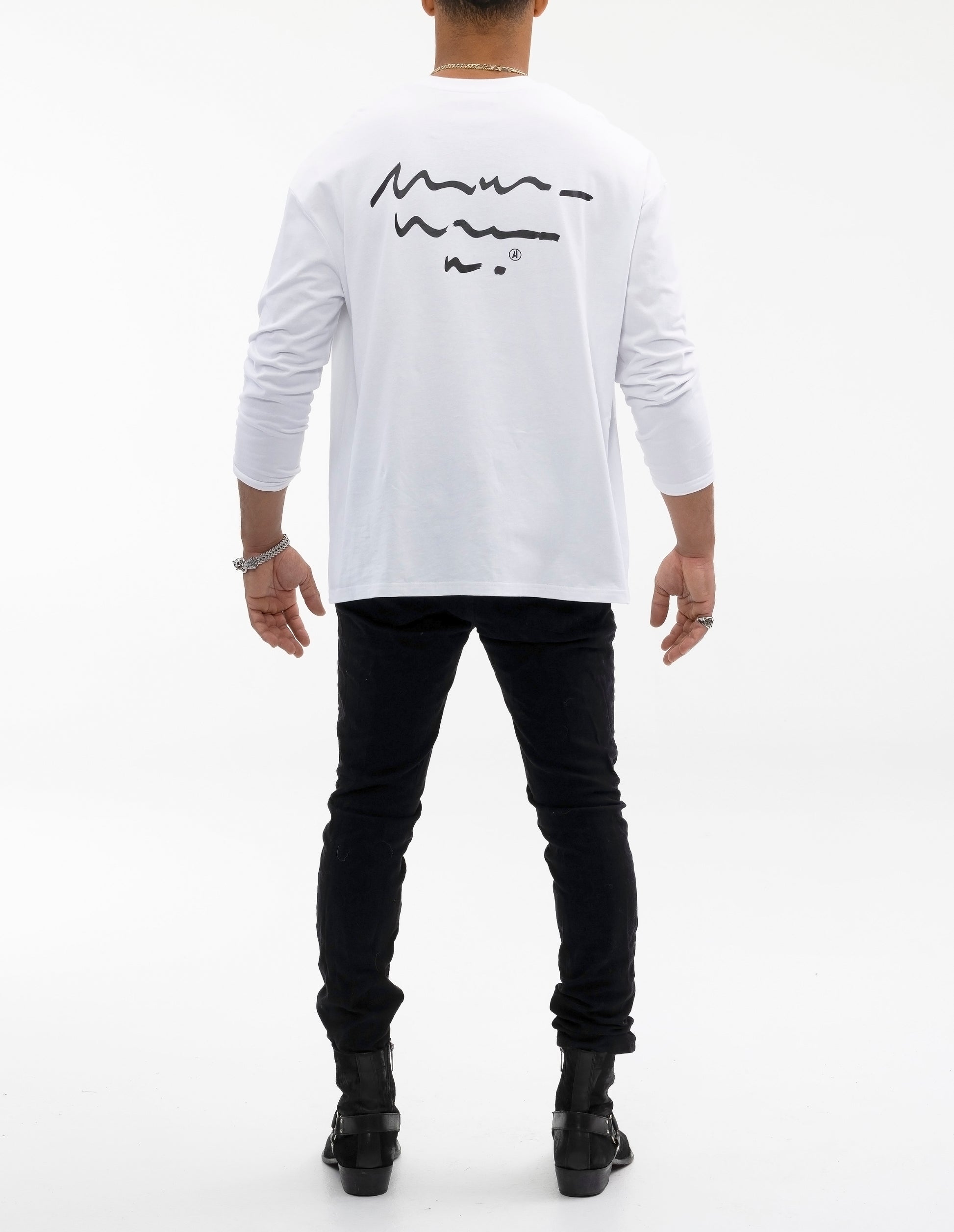 •This long sleeve tee spotlights the season’s new graphic signature. Tailored in a slightly tented fit, the screen print at the back of the garment features a sprightly scripted paragraph. There are no legible wording leaving question and curiosity. There is a ideogram that is recognizable to the Registered Trademark symbol - but instead of the R'', there is an 'A' for Abel. Cut from medium weight responsibly produced cotton looped into a condensed jersey knit.